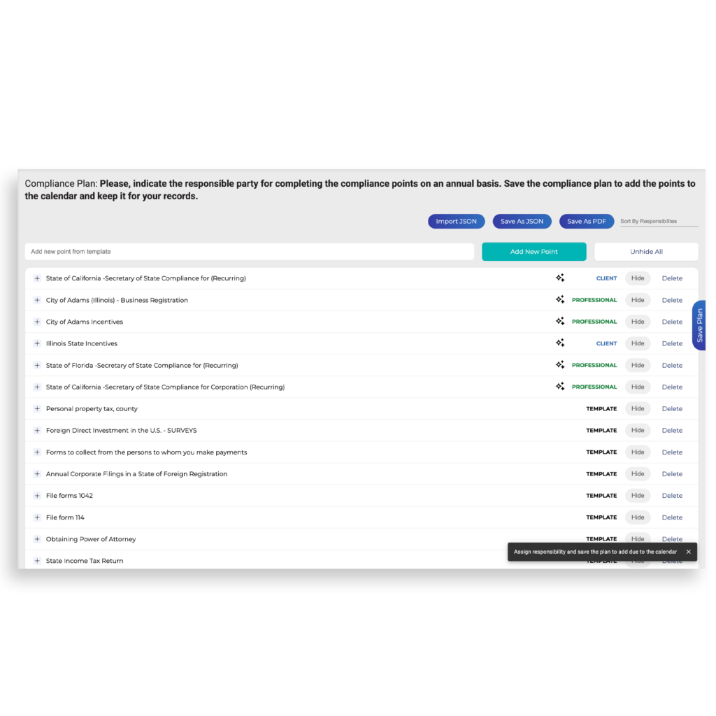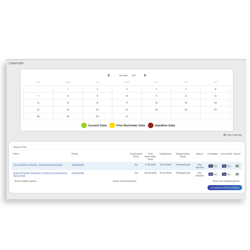 Stay ahead with our integrated Calendar. Automatically track deadlines, schedule reminders, and manage compliance tasks effortlessly.