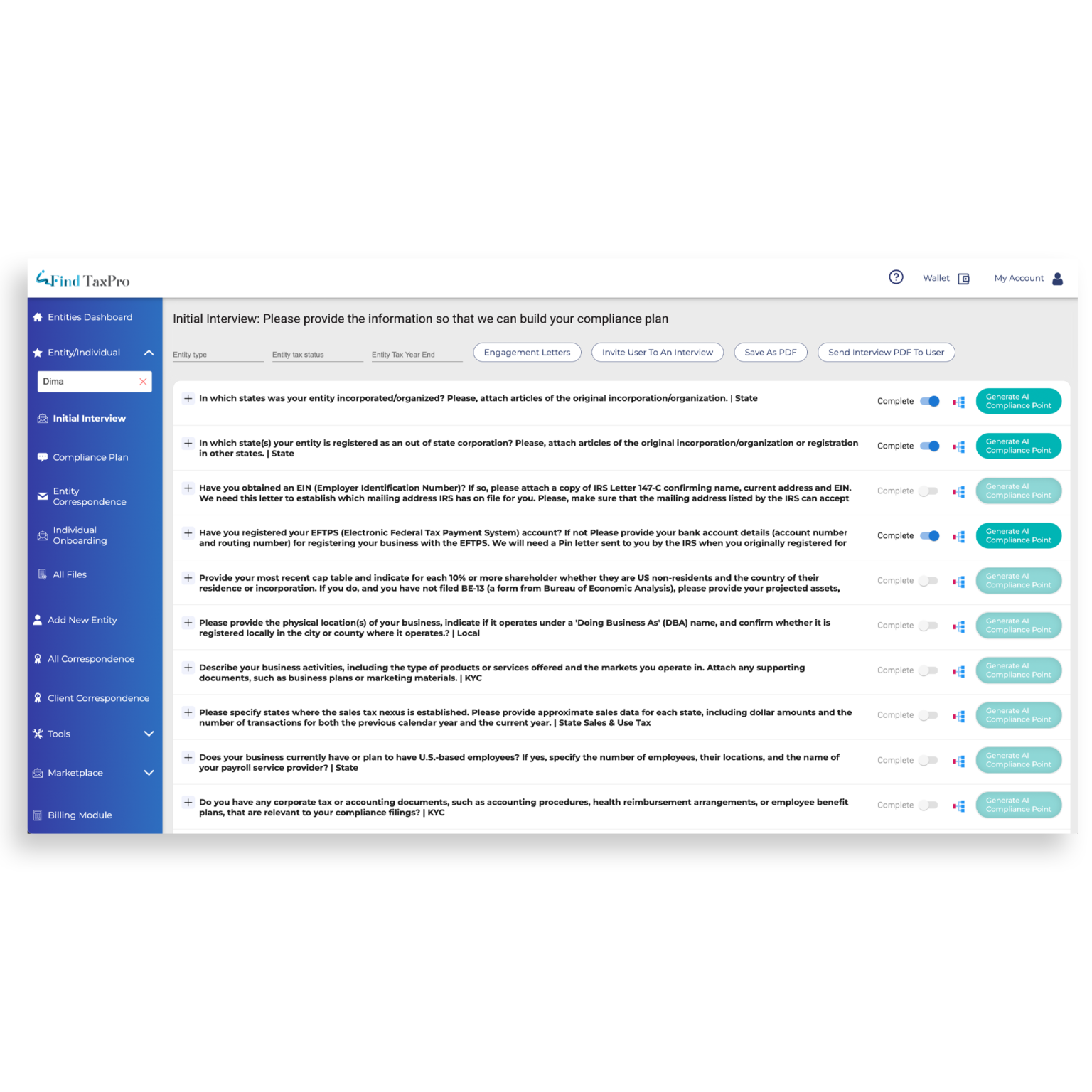 The Initial Interview sets the foundation for customized compliance planning. Gather all essential data with a guided questionnaire designed to identify key compliance needs.